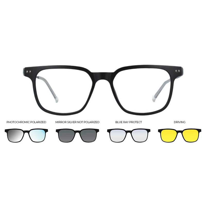 - Montatura di plastica di colore nero opaco con 4 clip magnetiche di colore nero opaco